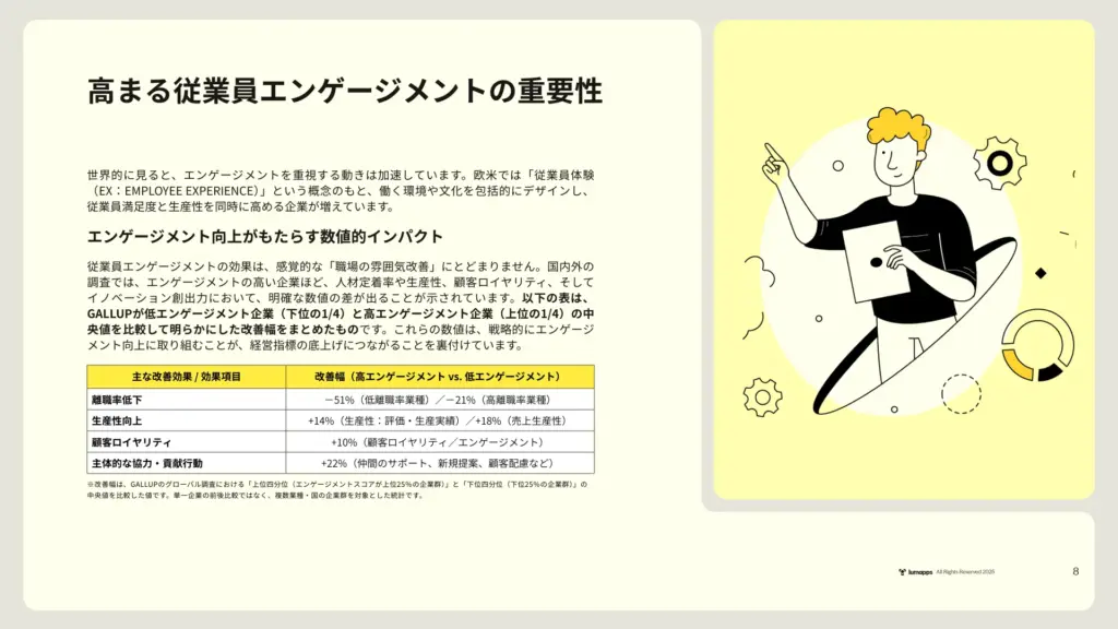 日本における従業員意識の変化、テレワーク/ハイブリッドワークの普及、情報過多とツール分散、そしてエンゲージメントの重要性をデータと共に整理。